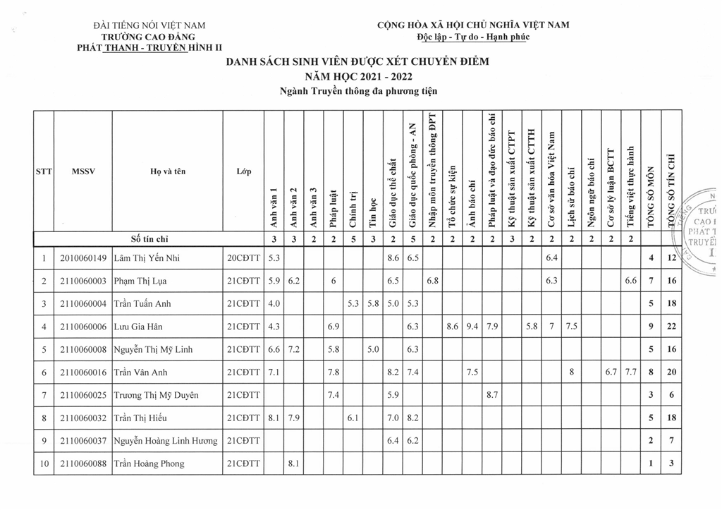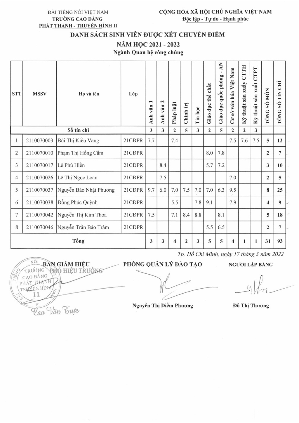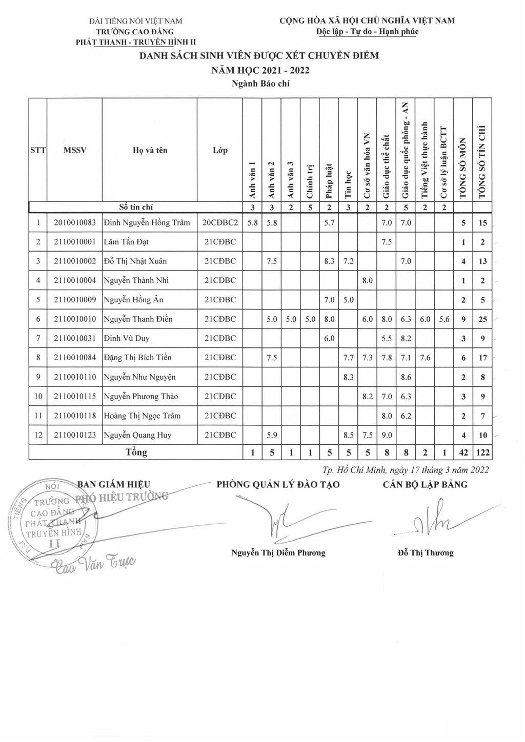 KẾT QUẢ CHUYỂN ĐIỂM NĂM HỌC 2021 - 2022