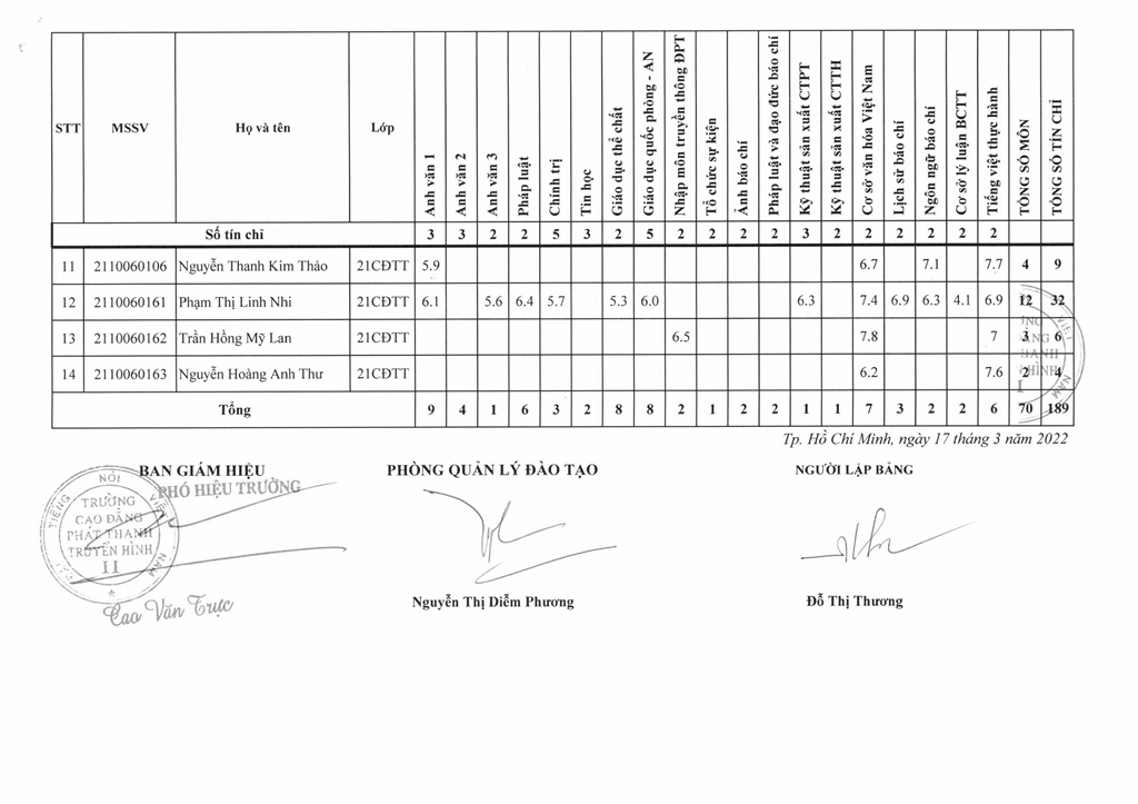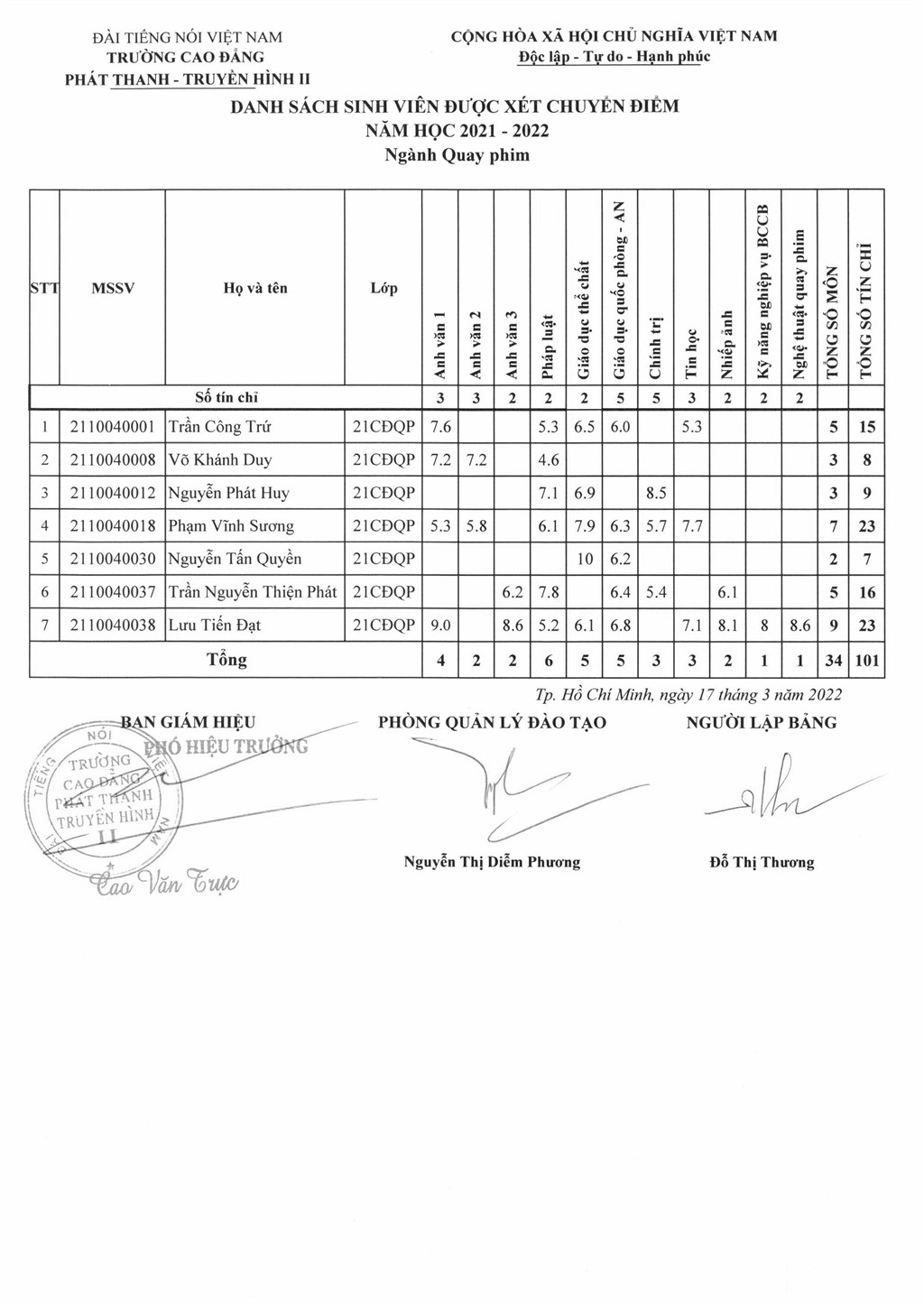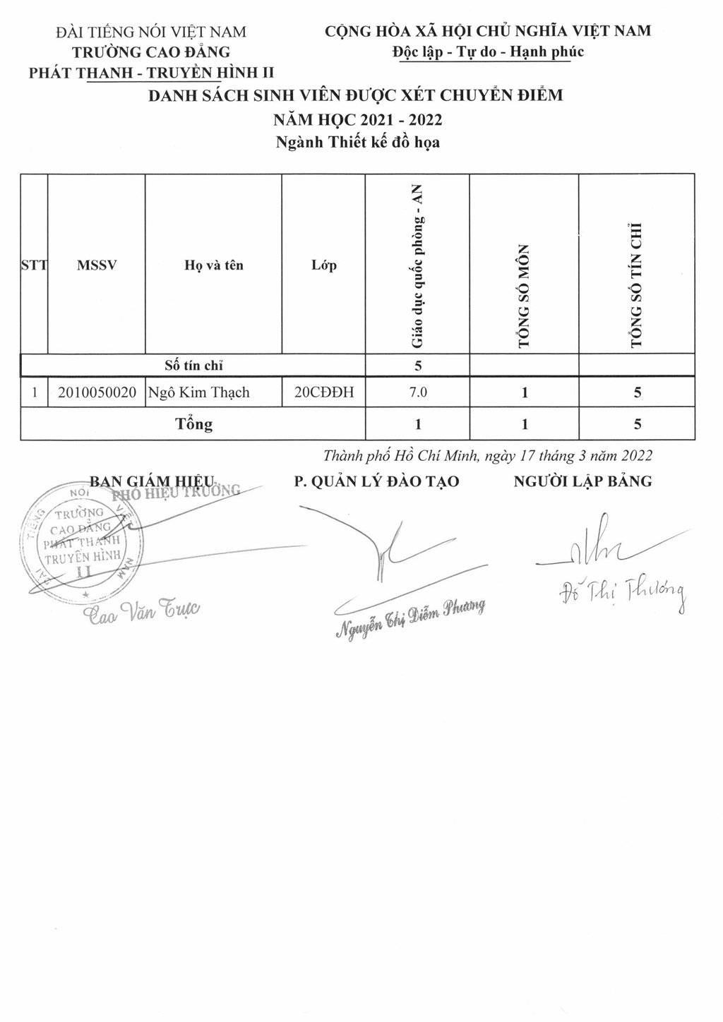 KẾT QUẢ CHUYỂN ĐIỂM NĂM HỌC 2021 - 2022