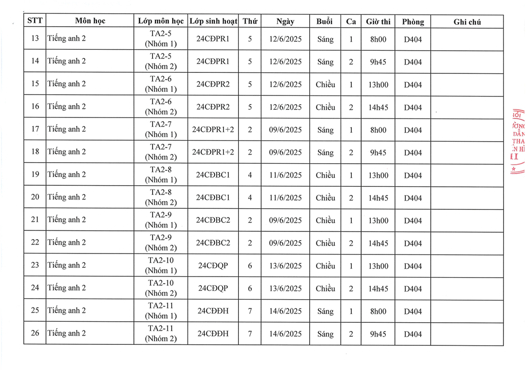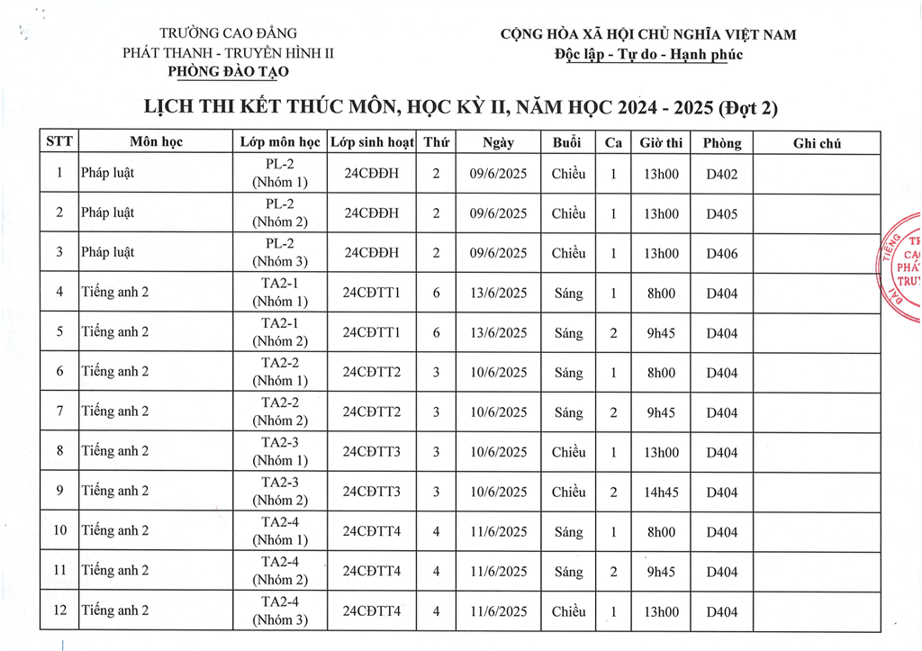 LỊCH THI KẾT THÚC MÔN, HỌC KỲ II, NĂM HỌC 2024 - 2025 (ĐỢT 2)