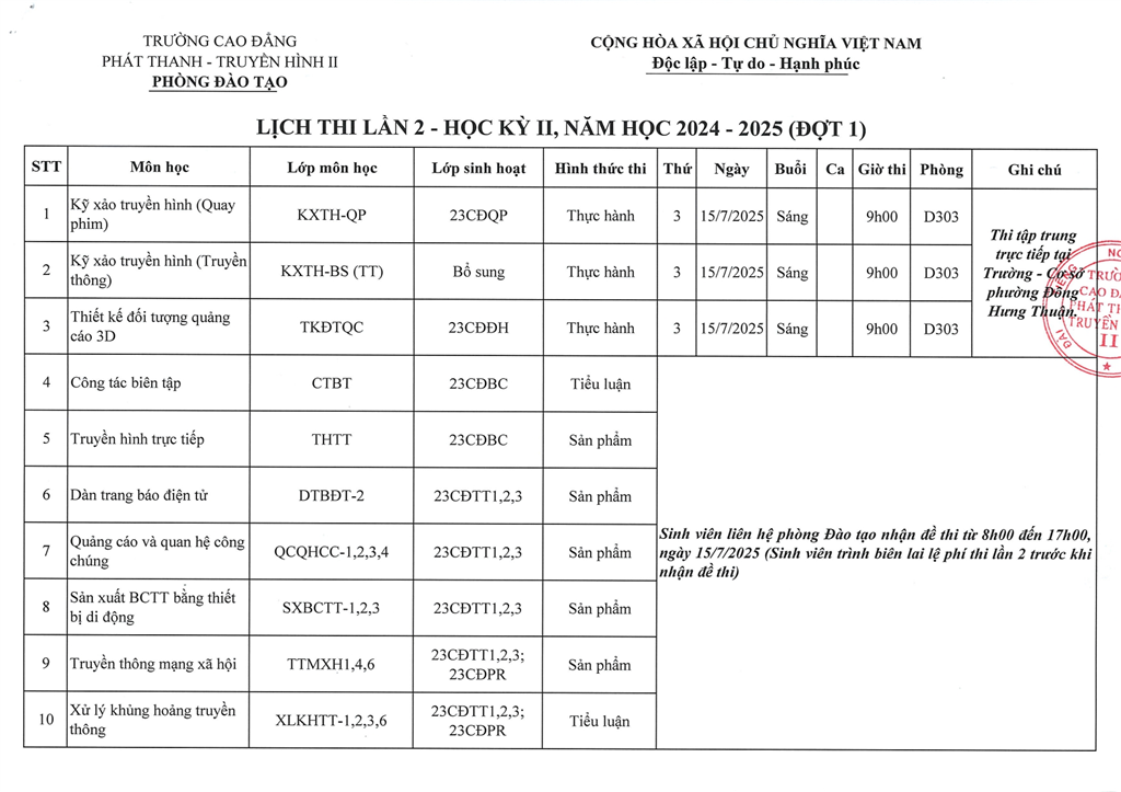 LỊCH THI KẾT THÚC MÔN, HỌC KỲ II, NĂM HỌC 2024 - 2025 (ĐỢT 2)