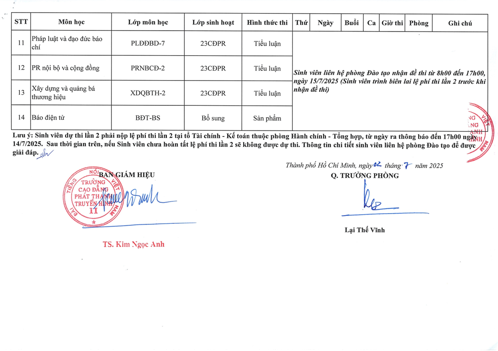 LỊCH THI VÀ DANH SÁCH LẦN 2, HỌC KỲ II, NĂM HỌC 2024 - 2025 (ĐỢT 1)
