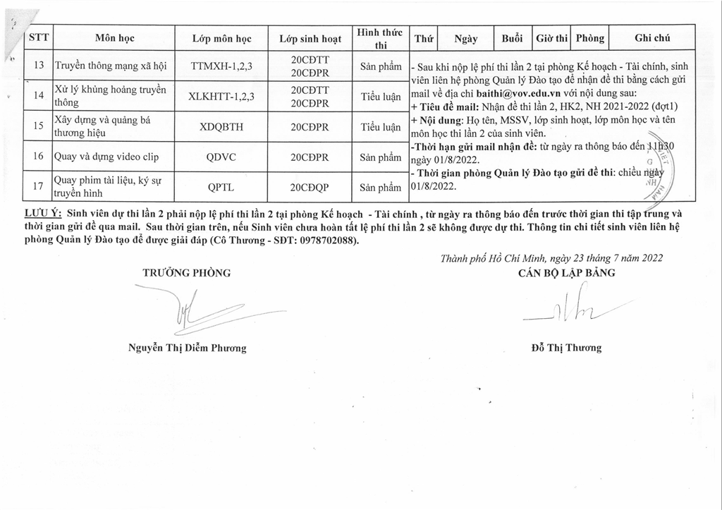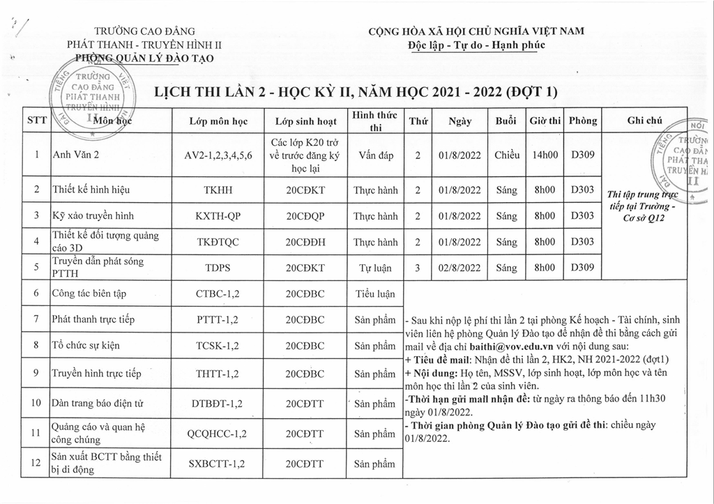 Lịch thi và danh sách thi lần 2, học kỳ 2, năm học 2021 - 2022 (Đợt 1)