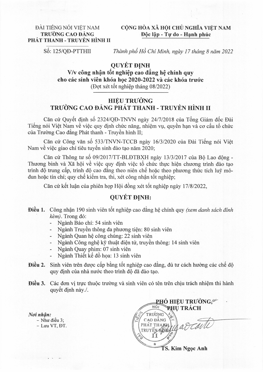 Quyết định về việc tốt nghiệp cao đẳng hệ chính quy cho các sinh viên khóa học 2020 - 2022 và các khóa trước