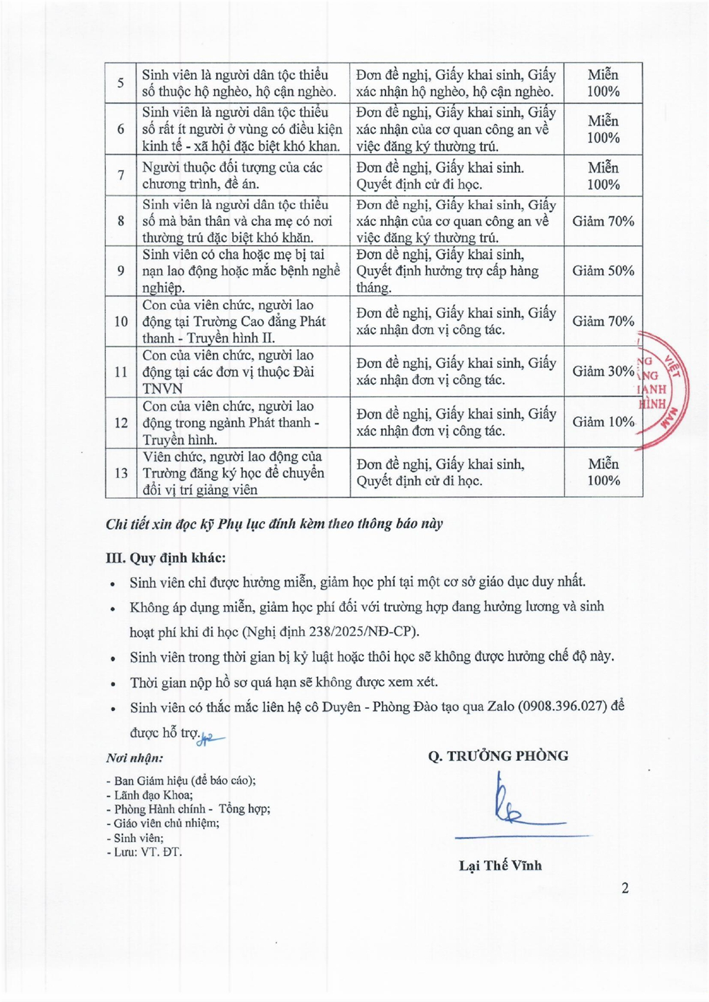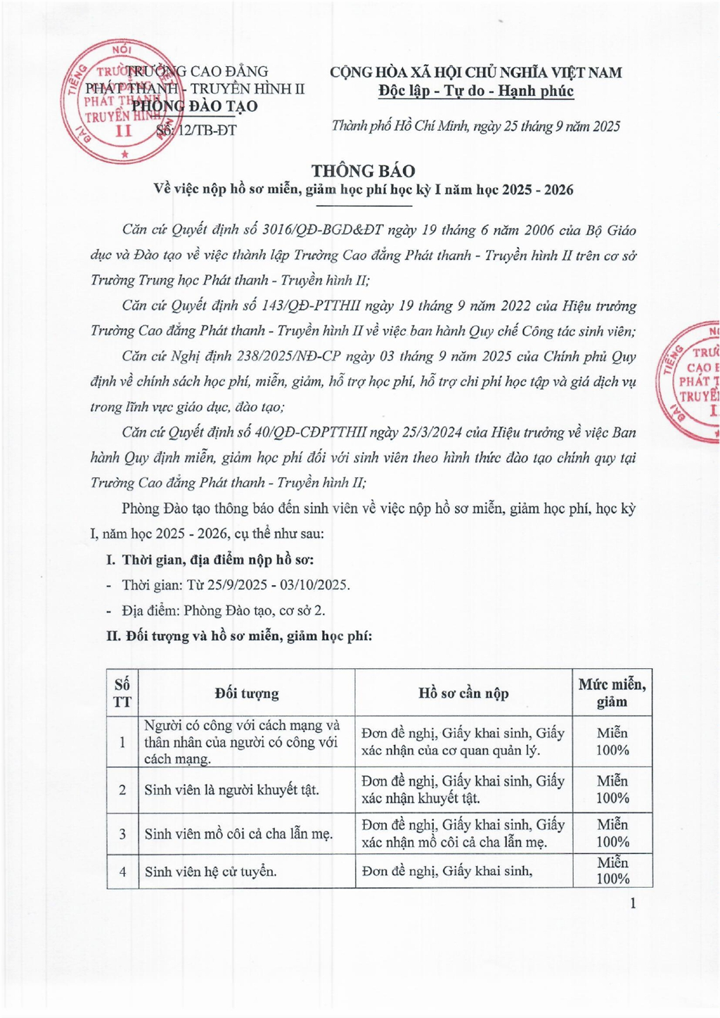 Thông báo số về việc nộp hồ sơ miễn, giảm học phí học kỳ I năm học 2025 - 2026