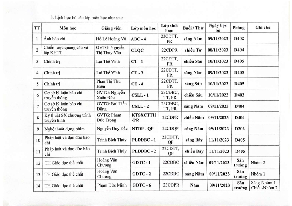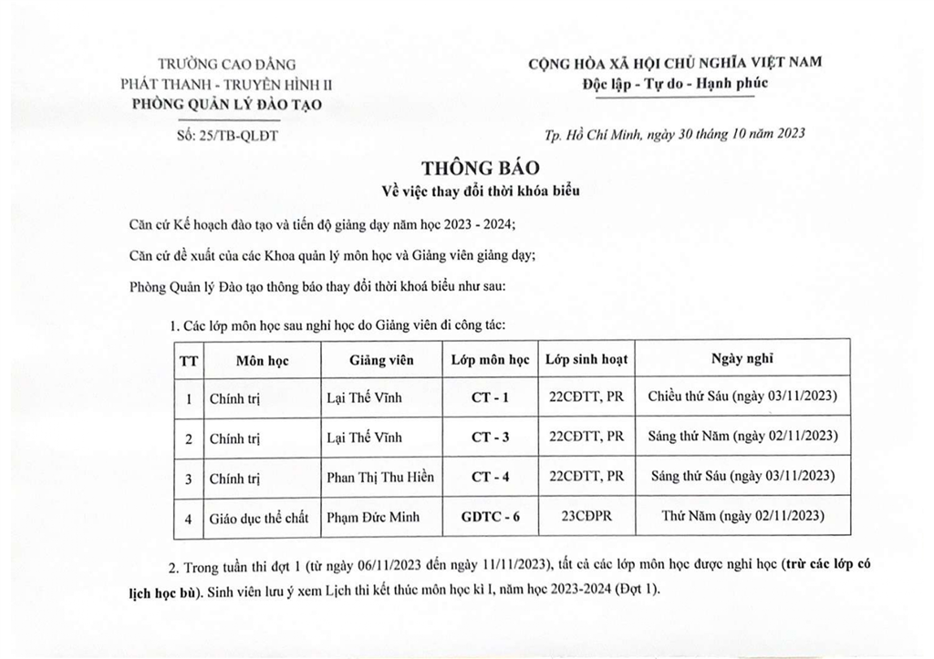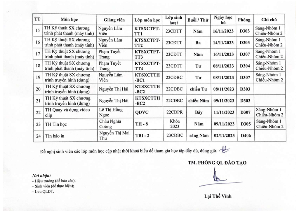 Thông báo thay đổi thời khoá biểu