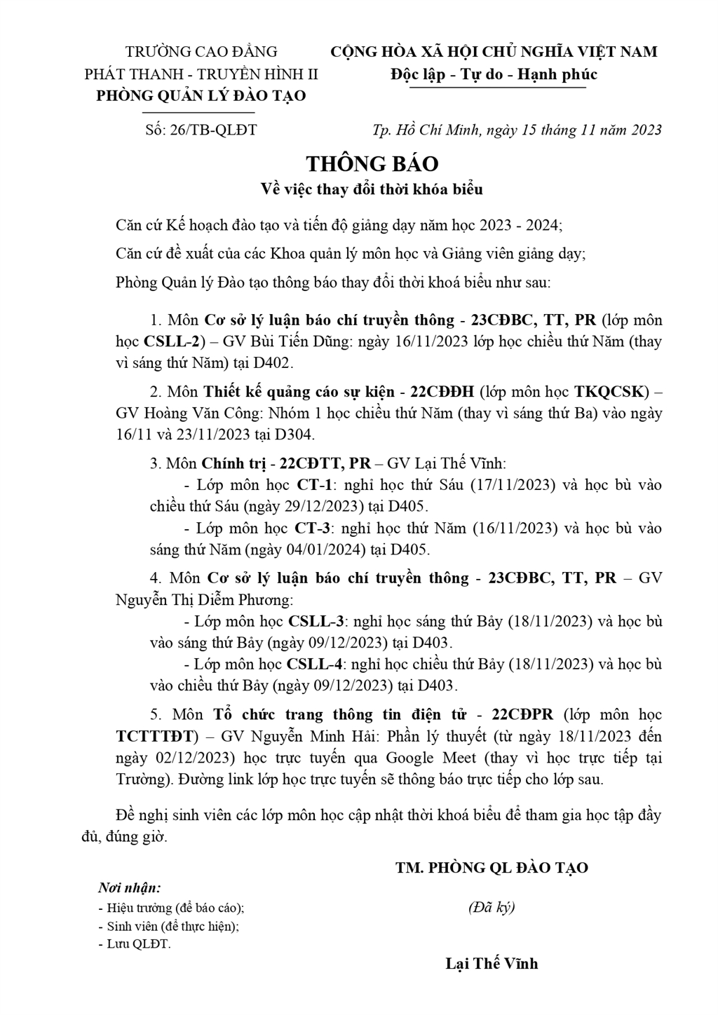 Thông báo về việc mở lớp bổ sung môn học học kỳ 1, năm học 2025-2026