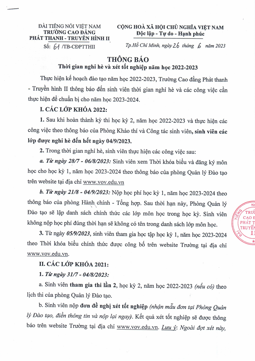 Thông báo về thời gian nghỉ hè và xét tốt nghiệp năm học 2022 - 2023