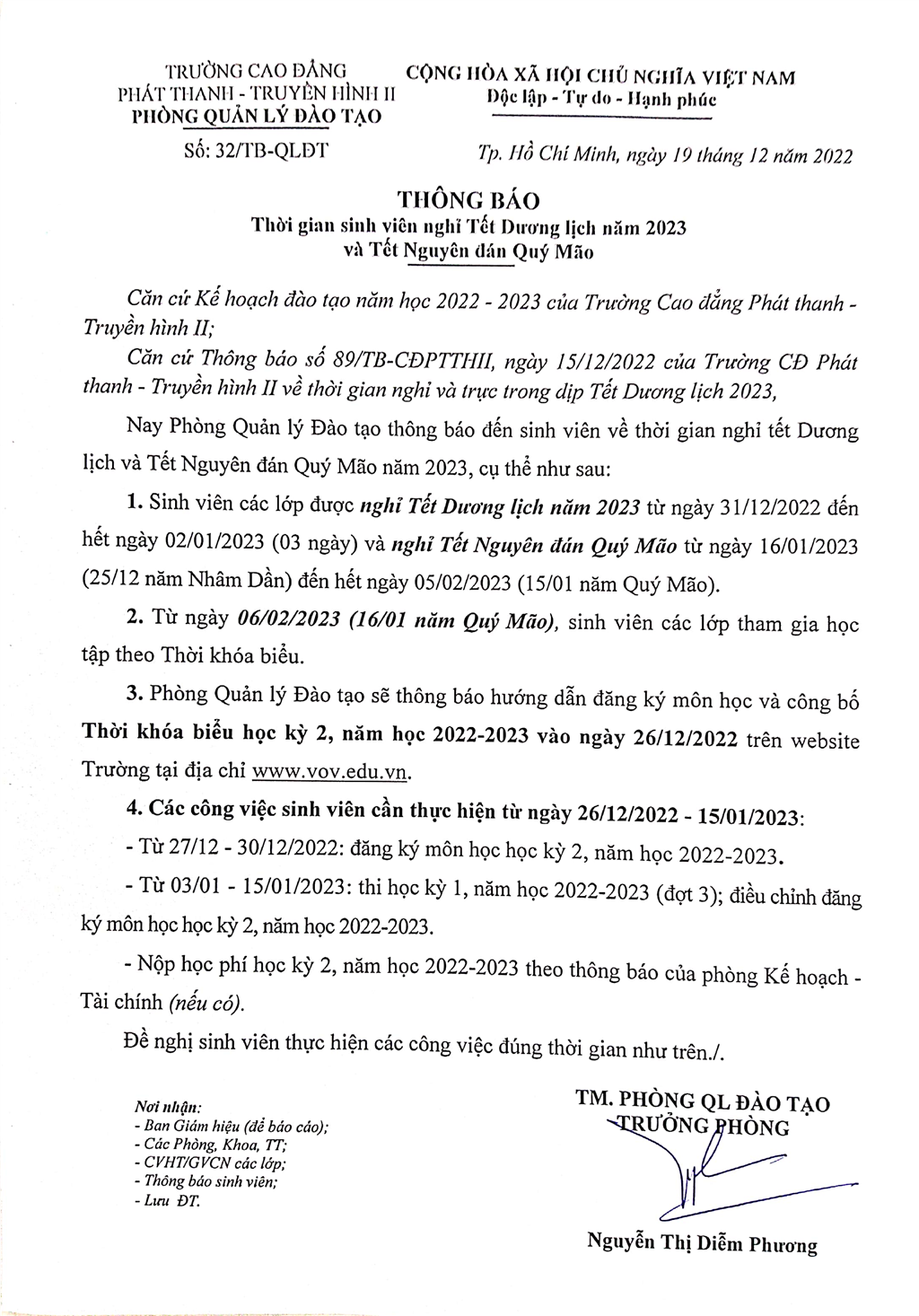 Thông báo về thời gian sinh viên nghỉ Tết dương lịch năm 2023 và Tết Nguyên đán Quý Mão