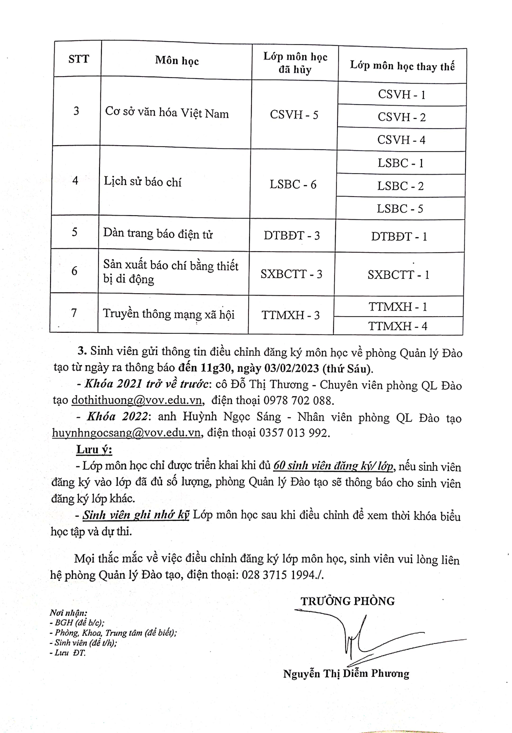 Thông báo về việc điều chỉnh đăng kí lớp môn học học kì 2, năm học 2022 - 2023