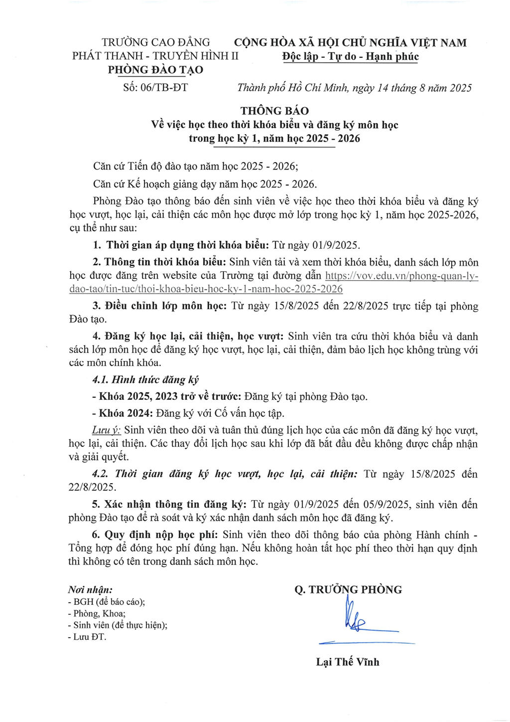 2. Thông tin thời khóa biểu: Sinh viên tải và xem thời khóa biểu, danh sách lớp môn học được đăng trên website của Trường tại đường dẫn https://vov.edu.vn/phong-quan-ly-dao-tao/tin-tuc/thoi-khoa-bieu-hoc-ky-1-nam-hoc-2025-2026