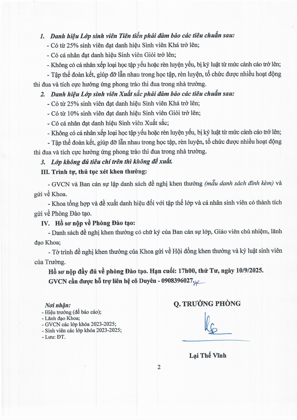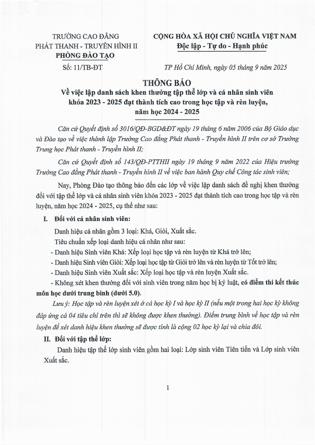 Thông báo về việc lập danh sách khen thưởng tập thể lớp và cá nhân sinh viên khóa 2023 - 2025 đạt thành tích cao trong học tập và rèn luyện, năm học 2024 - 2025
