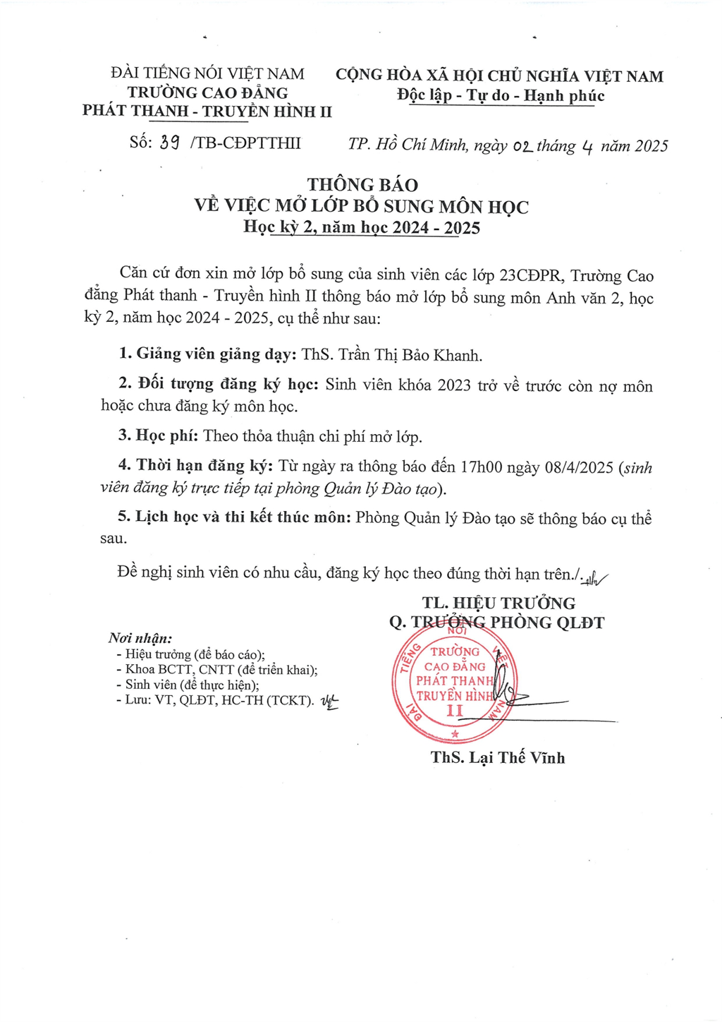 Thông báo về việc mở lớp bổ sung môn "Anh văn 2" của học kỳ II, năm học 2024 - 2025