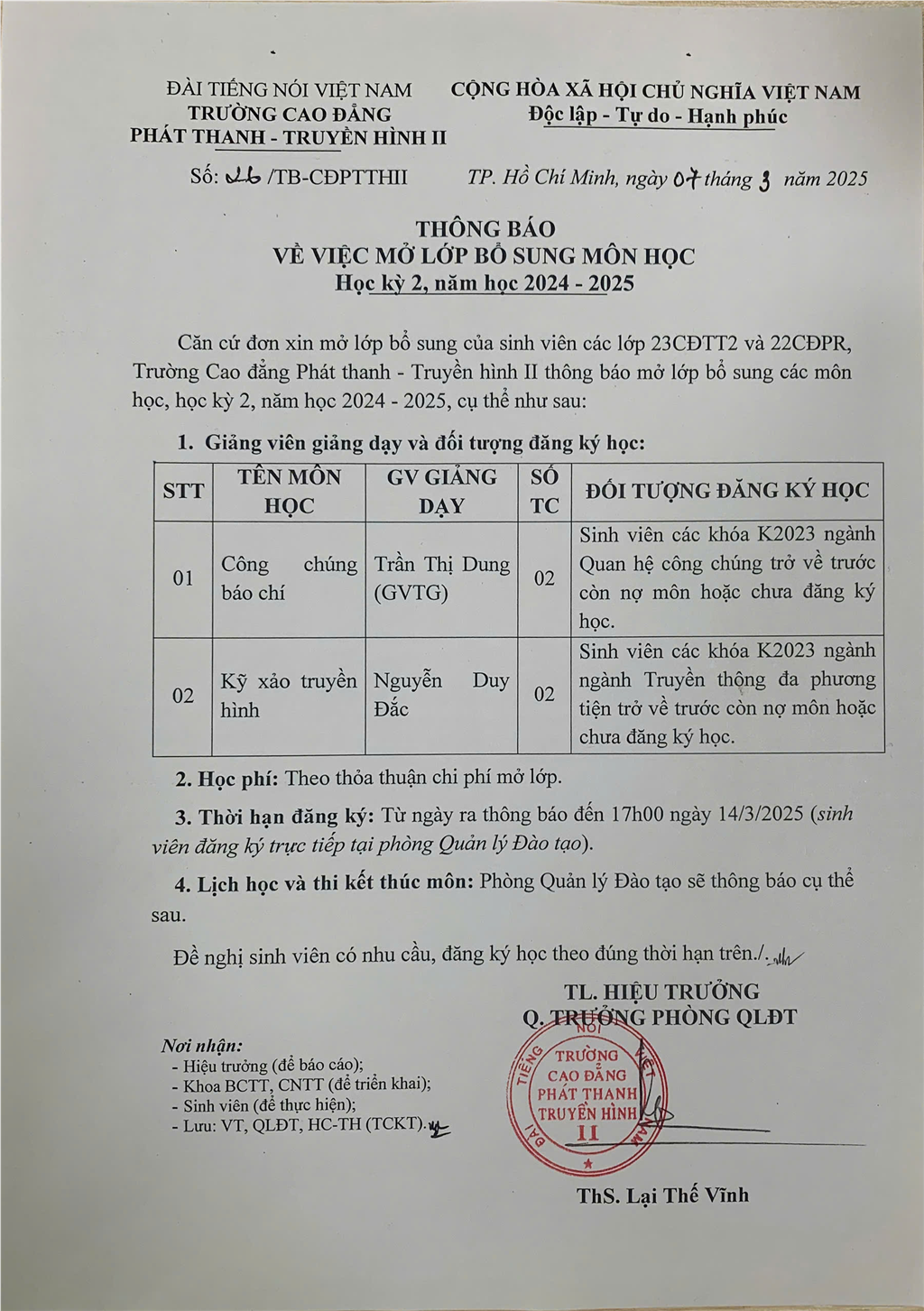 Thông báo về việc mở lớp bổ sung môn học học kỳ II, NH 2024 - 2025.