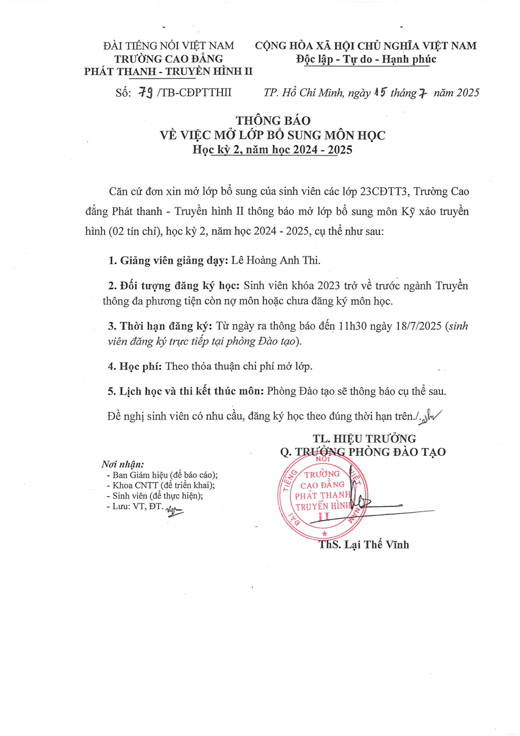 Thông báo về việc mở lớp bổ sung môn Kỹ xảo truyền hình (ngành truyền thông)