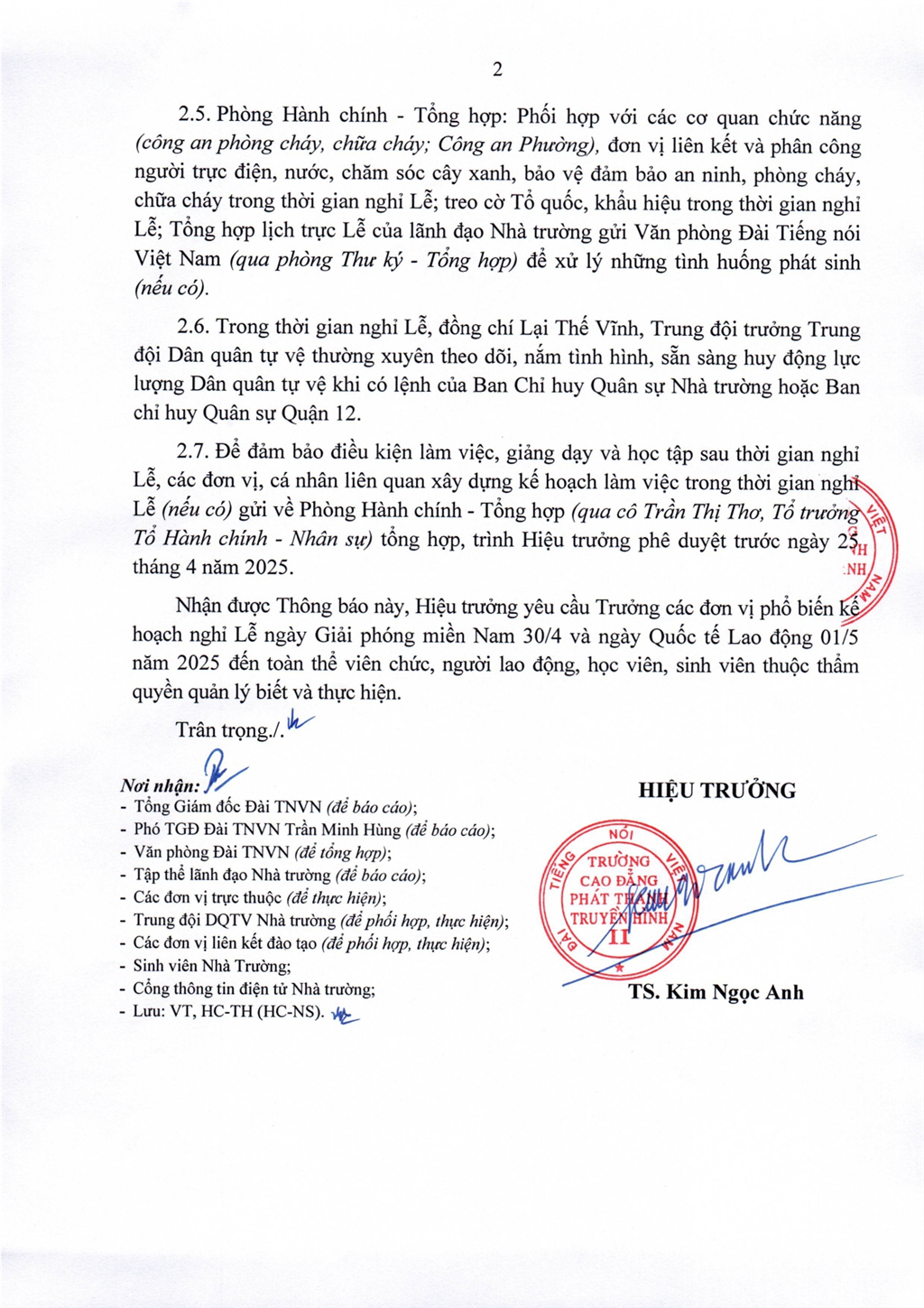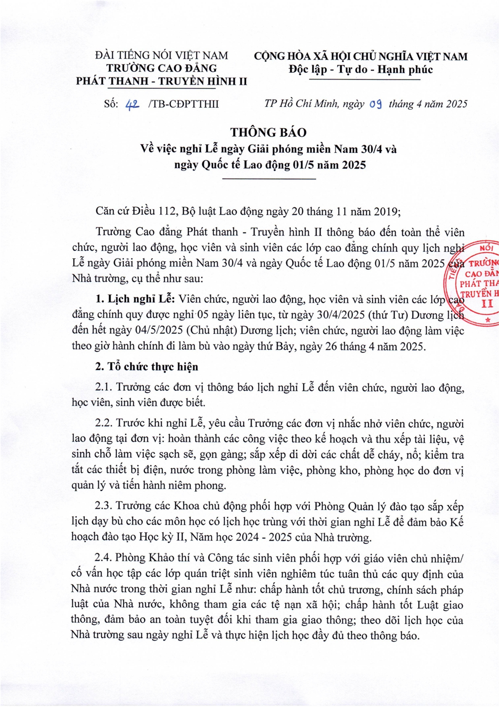 Thông báo về việc nghỉ Lễ ngày Giải phóng miền Nam 30/4 và ngày Quốc tế Lao động 01/5 năm 2025