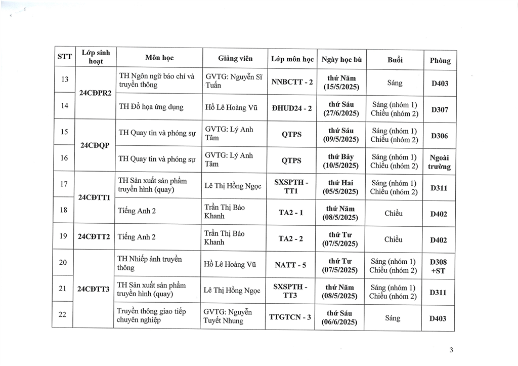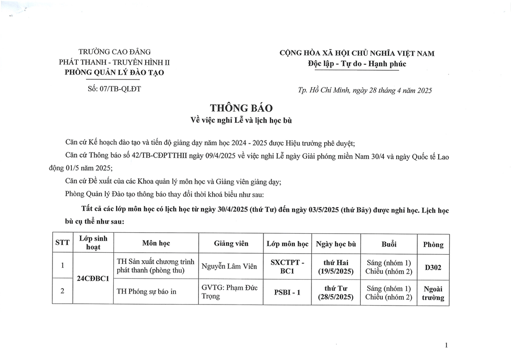 Thông báo về việc nghỉ Lễ và lịch học bù