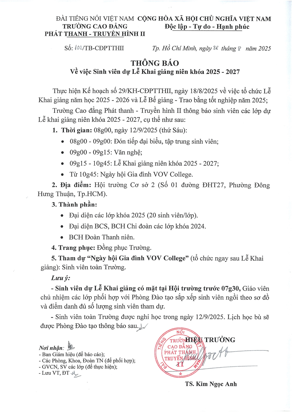 Thông báo về việc sinh viên dự Lễ Khai giảng niên khóa 2025 - 2027