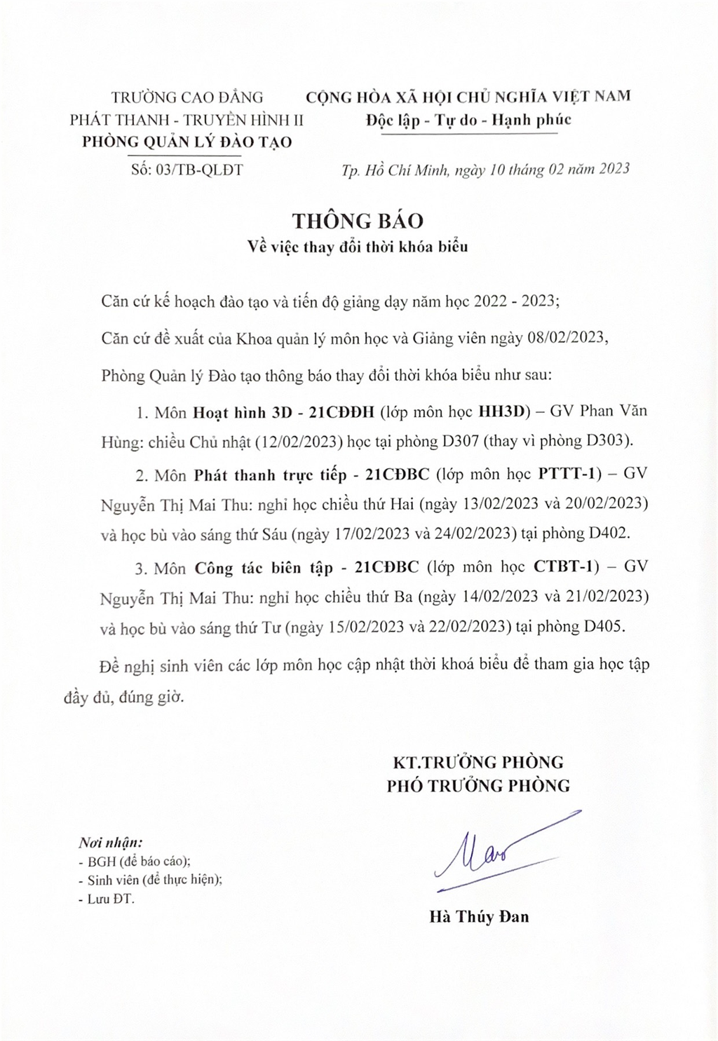 Thông báo về việc thay đổi thời khoá biểu