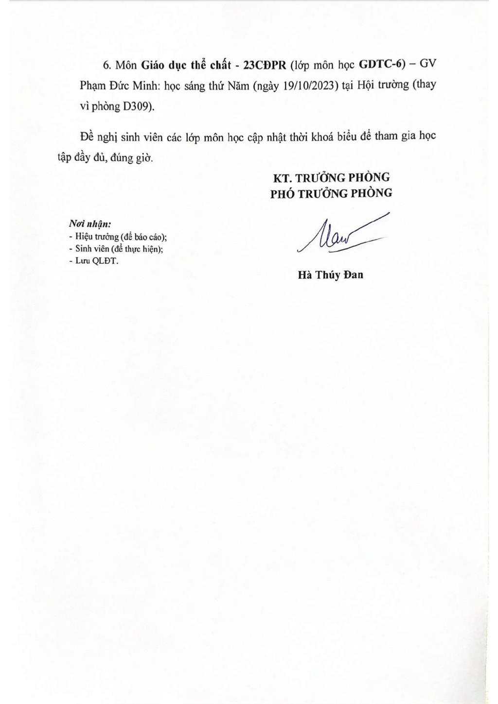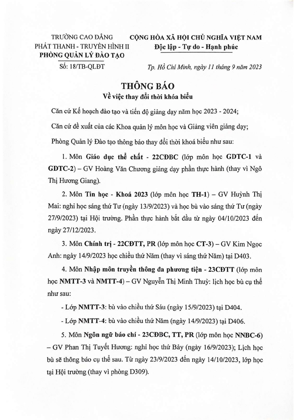 Thông báo về việc thay đổi thời khoá biểu