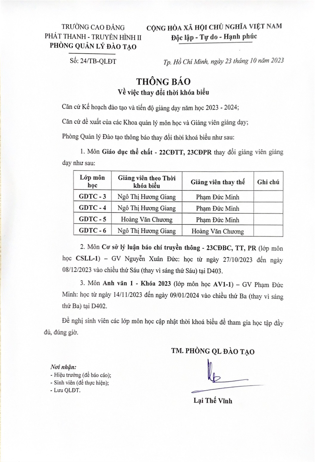 Thông báo về việc thay đổi thời khoá biểu