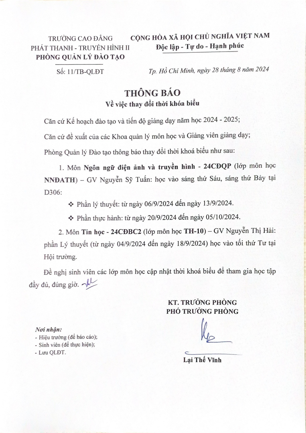 Thông báo về việc mở lớp bổ sung môn học học kỳ 1, năm học 2025-2026