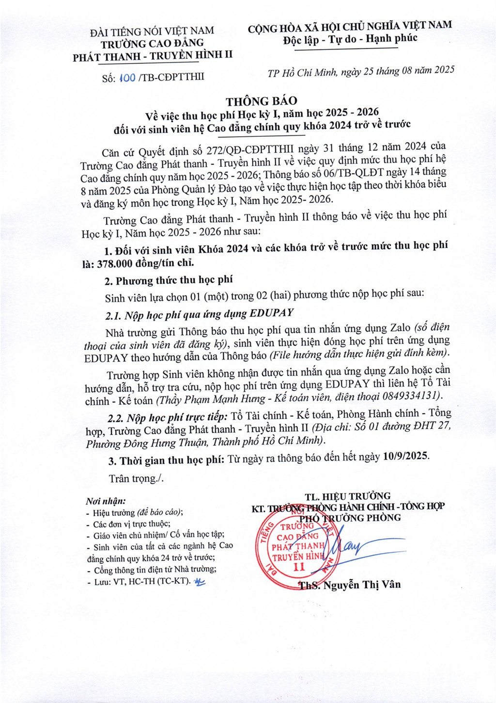 Thông báo về việc thu học phí Học kỳ 1, năm học 2025-2026 đối với sinh viên hệ Cao đẳng chính quy khóa 2024 trở về trước